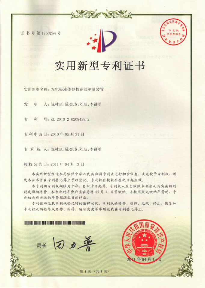 雙電極液體參數在線(xiàn)測量裝置(雙電極測量裝置),專(zhuān)利號:ZL 2010 2 0209439.2