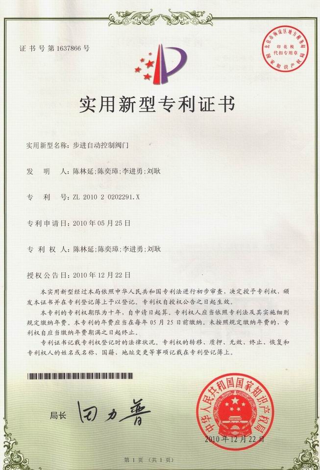 步進(jìn)自動(dòng)控制閥門(mén),專(zhuān)利號:ZL 2010 2 0202291.X