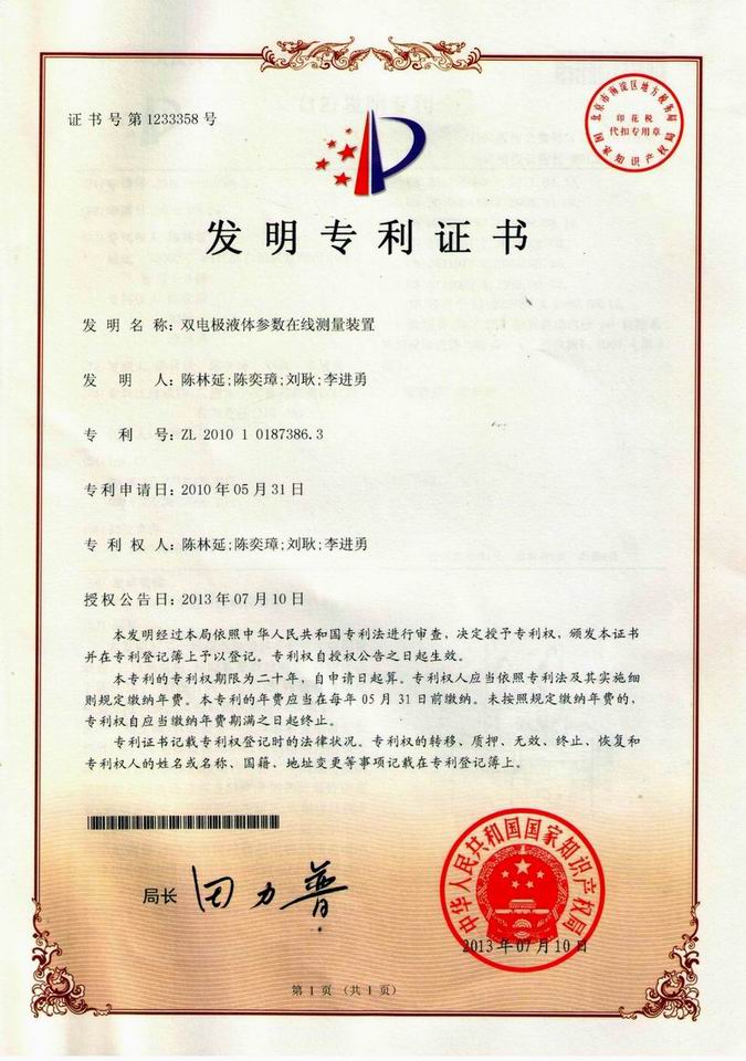 本發(fā)明的目的是提供一個(gè)雙電極液體多參數在線(xiàn)測量裝置,結構簡(jiǎn)單,工作可靠和使用方便,能同時(shí)檢測多個(gè)液體的相關(guān)參數,自動(dòng)清洗電極表面,提高檢測精度。我司著(zhù)重加大對科研的投入力度,積極開(kāi)展技術(shù)創(chuàng )新工作,通過(guò)多年來(lái)的努力,公司獲得國家專(zhuān)利授權多項,其中發(fā)明專(zhuān)利2項,實(shí)用新型專(zhuān)利4項,在審的發(fā)明專(zhuān)利3項。