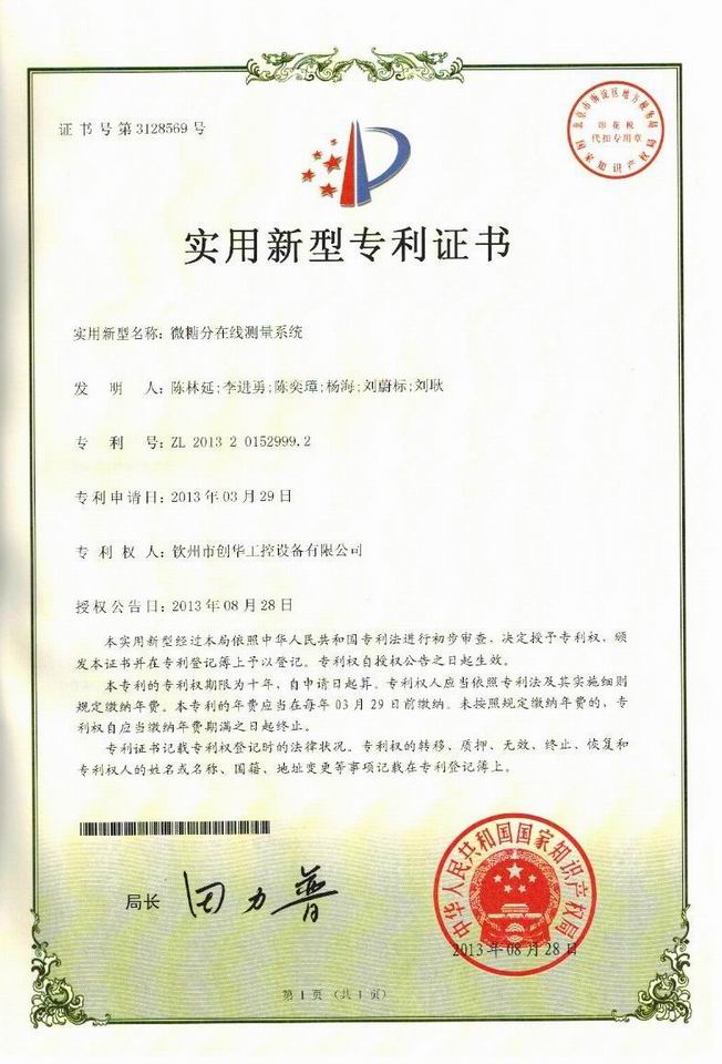 創(chuàng )華工控“微糖分在線(xiàn)測量系統”喜獲國家專(zhuān)利