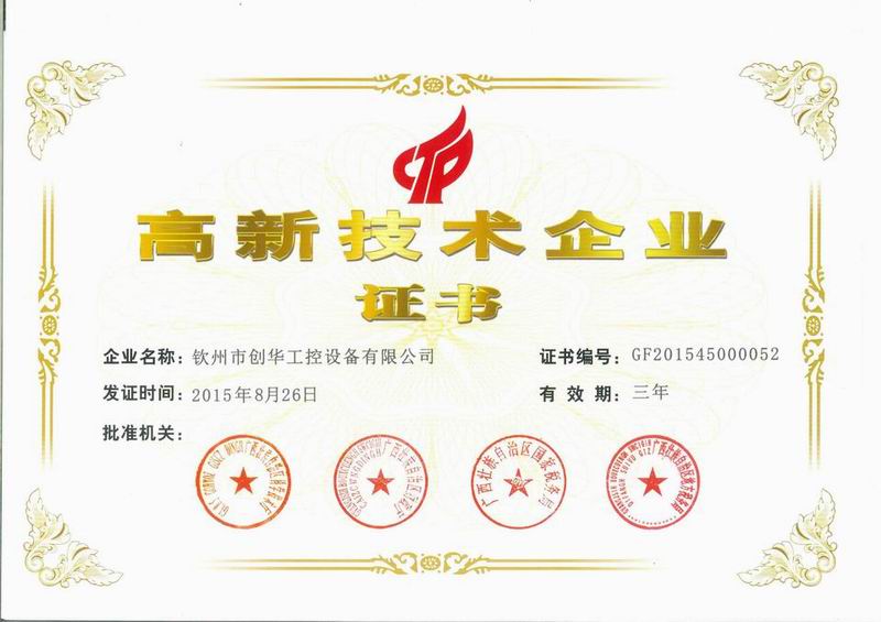 欽州市創(chuàng )華工控設備有限公司順利通過(guò)廣西壯族自治區2015年第一批高新技術(shù)企業(yè)復審。
