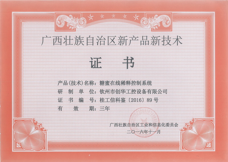 項目針對糖廠(chǎng)結晶工段糖蜜稀釋工序無(wú)法按需連續稀釋、溶晶不徹底、溫度波動(dòng)大,影響產(chǎn)品質(zhì)量和糖分回收的現狀,研發(fā)出“糖蜜在線(xiàn)稀釋系統”,實(shí)現了糖蜜稀釋過(guò)程中溶晶徹底,錘度和溫度有效控制,使結晶罐能做到沸點(diǎn)連續入料。項目產(chǎn)品“糖蜜在線(xiàn)稀釋系統”獲得廣西壯族自治區工業(yè)和信息化委員會(huì )委頒發(fā)的新產(chǎn)品新技術(shù)證書(shū)。